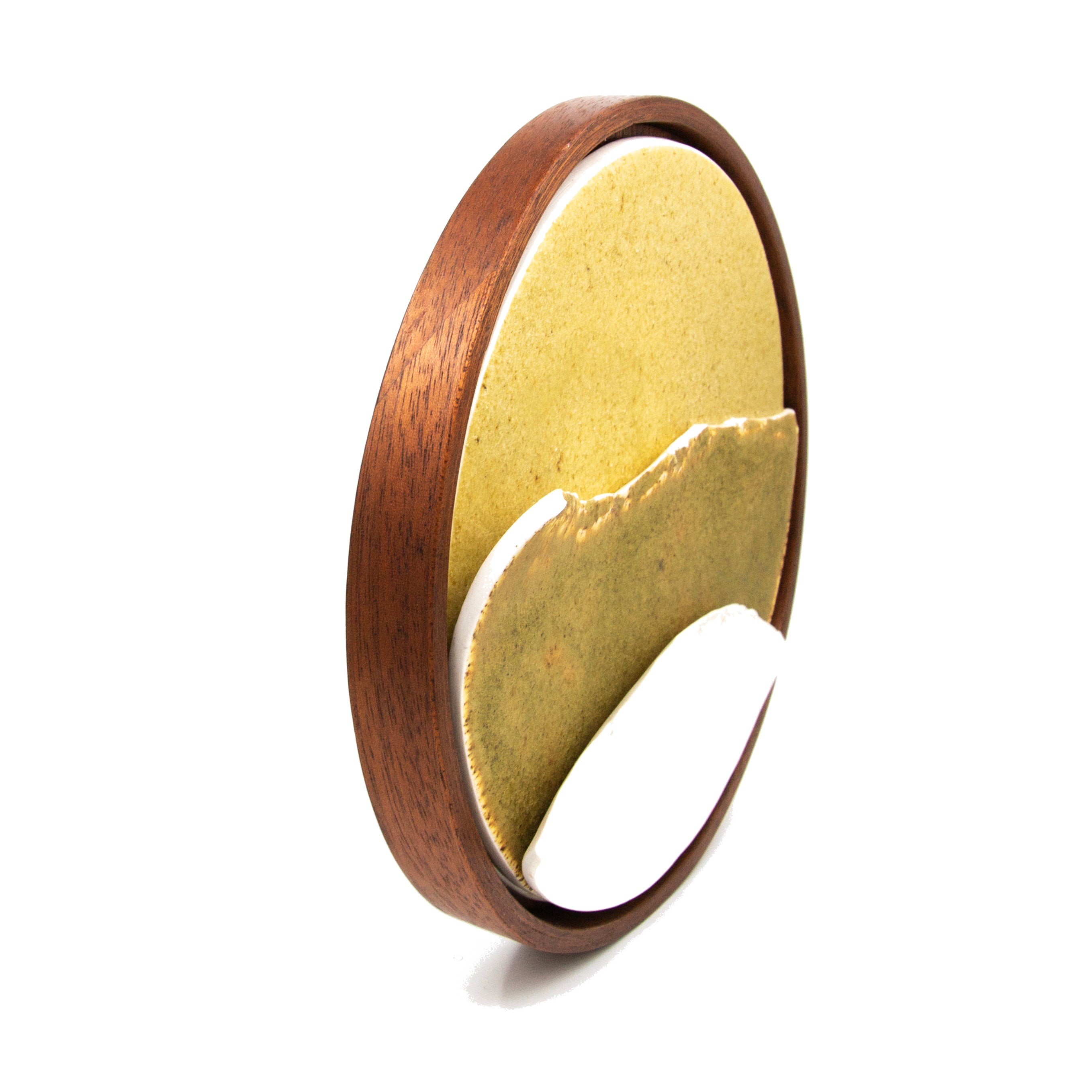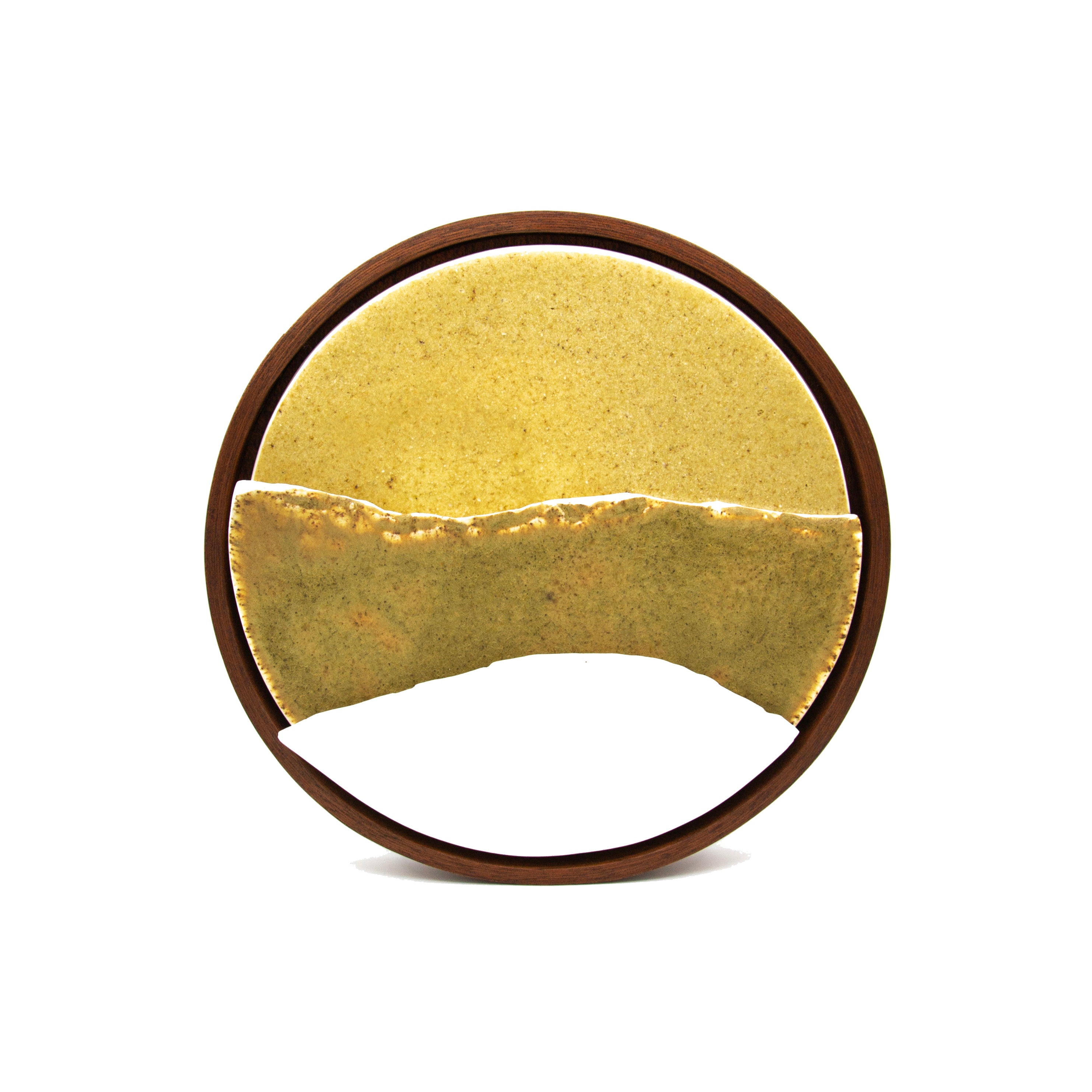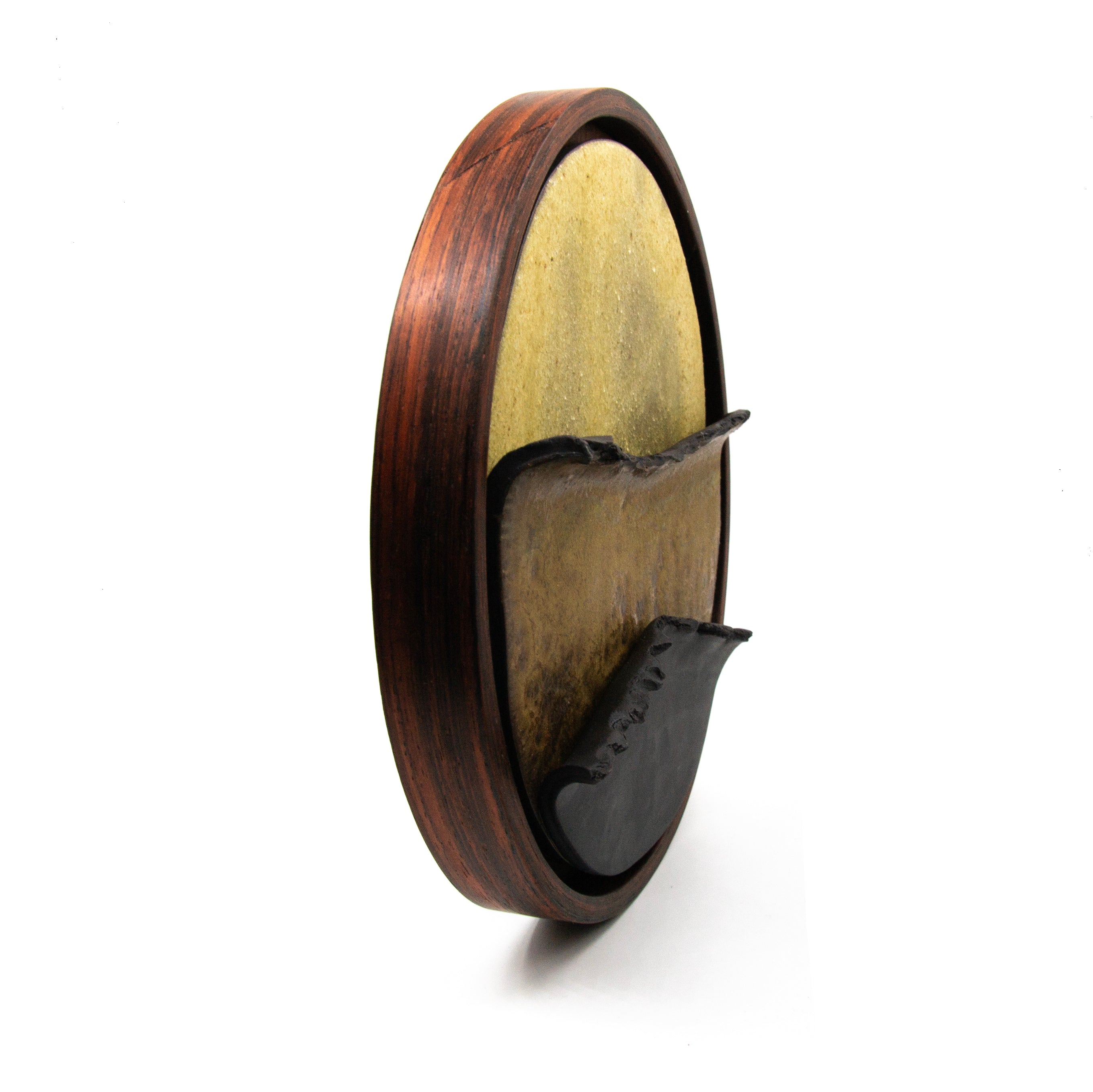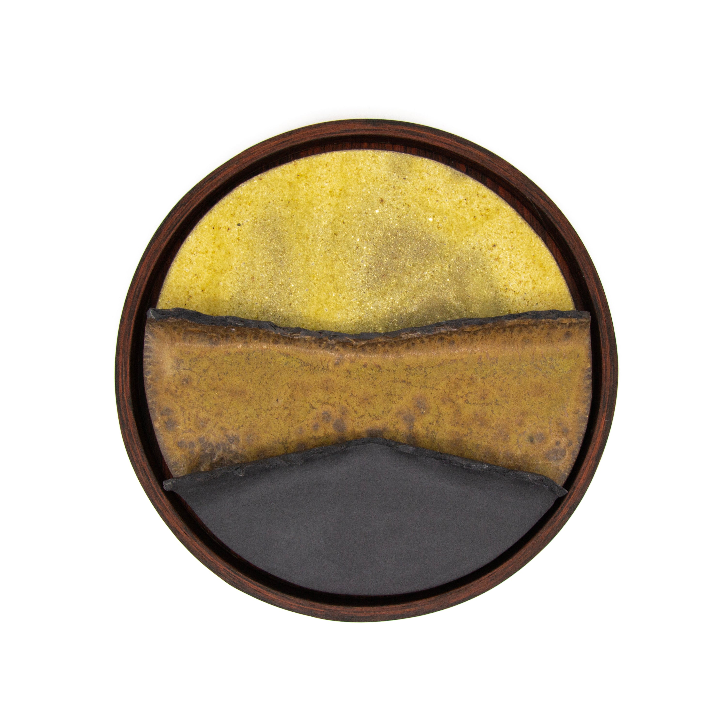 Porcelaine, émaux naturels de roches (trapp, granite et grès). Diamètre 20 cm. Cadre en palissandre de rio réalisé par Jill Poullin, ébeniste d'art.