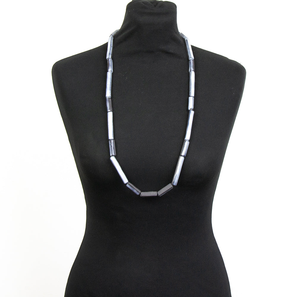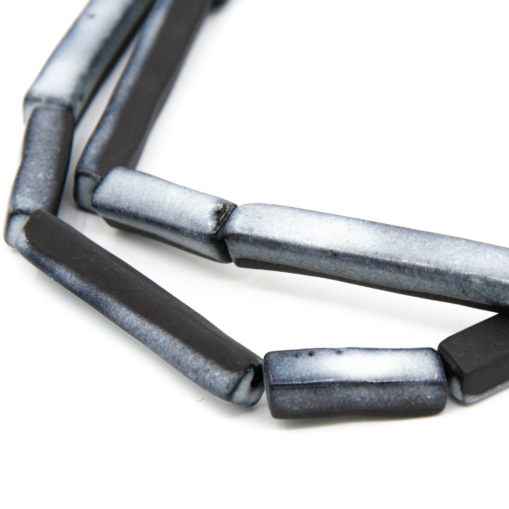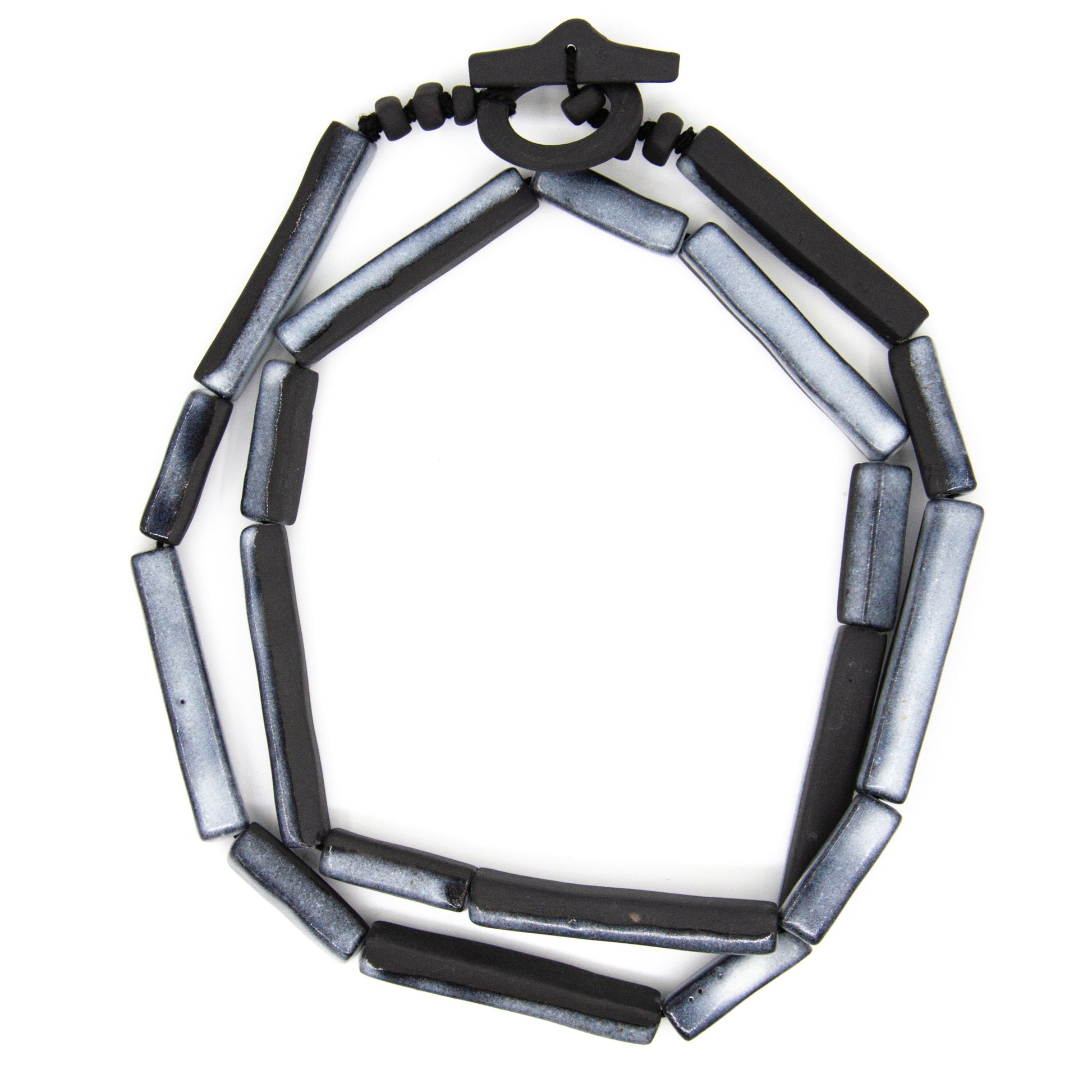 Ce sautoir en céramique est recouvert d'un émail naturel à base de cendres de bois. Entièrement façonnées à la main, les perles rectangulaires sont partiellement laissées brutes, partiellement émaillées pour un aspect bicolore. La douceur de la porcelaine alliée à la brillance de l'émail de cendres. Un bijou élégant, unique et original.